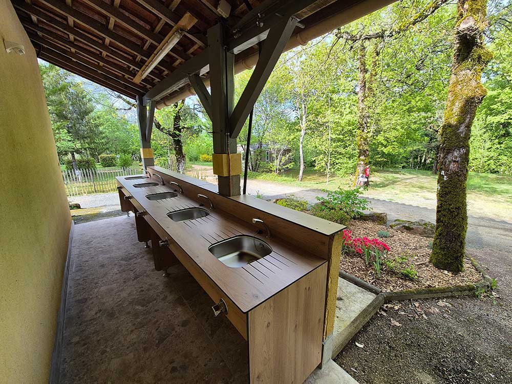 Het sanitairgebouw is gelegen op het midden van de camping. U vindt er afwasgelegenheid, toiletten, douchecabines, wasbakken, en aan de ‘dameskant’ een wasmachine en droger. Een strijkplank en strijkijzer zijn te leen bij de receptie. Er zijn eveneens een baby badje en een aangepast sanitair aanwezig.