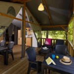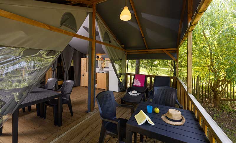 Glamping in de Dordogne. Het echte Glamping gevoel krijgt u in deze mooie Safaritent ! Het dak loopt nog een stuk door en geeft daarmee deze accommodatie een fijne overdekte veranda, wat het buiten zitten nog extra comfort en gezelligheid geeft. Daarbij helpt het ook te schuilen voor de zon of een zomers buitje.